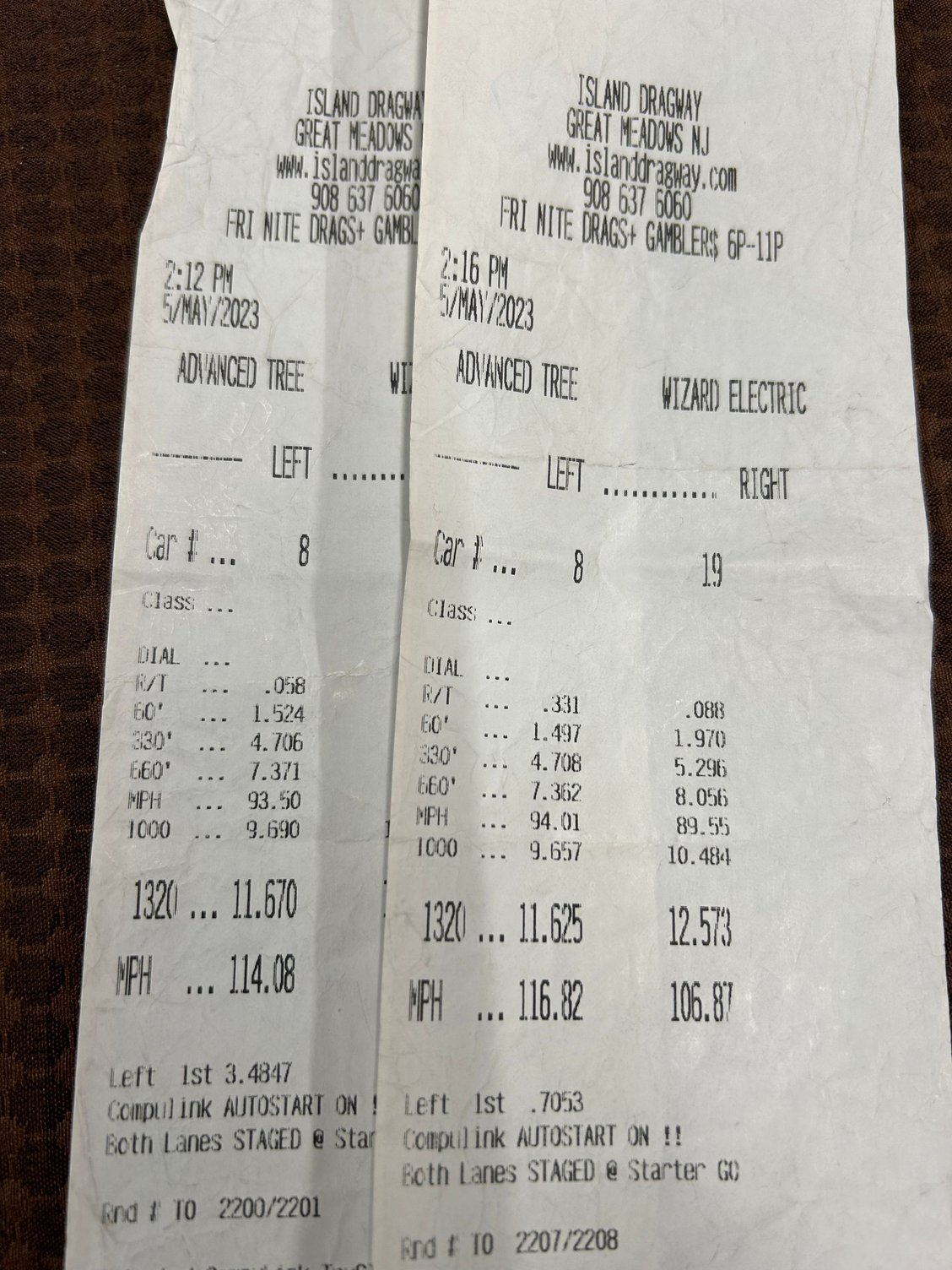 As for the all-motor pass, I also want to get that e.t. and mph better. My best mph was on pass 3 of May 28, 2023 where the car went 11.75 but at 18. 69 mph. It was 95.4 mph in the 8th mile. However the quickest e.t. pass was just a few weeks prior to the one before, and this was on May 5 2023. Pass 4 that day was all motor with 35 deg timing and it went 1.49 tot he sixty foot, 7.36 at 94 mph to the 8th and 11.62 at 116.8 mph that day., the pass right before that one was 11.67 at 114.08 mph with 34 deg of timing. So essentially the car is relatively capable of 11.65 at 117 mph with this converter and this 28" tall rear tire. My buddy John gave me a set of Hoosier QTP 27" tall bias ply tires that I think would be the right tire hight for me to crack into the 11.5x and possible 120 mph territory. Possibly, but its a good goal for 2024.