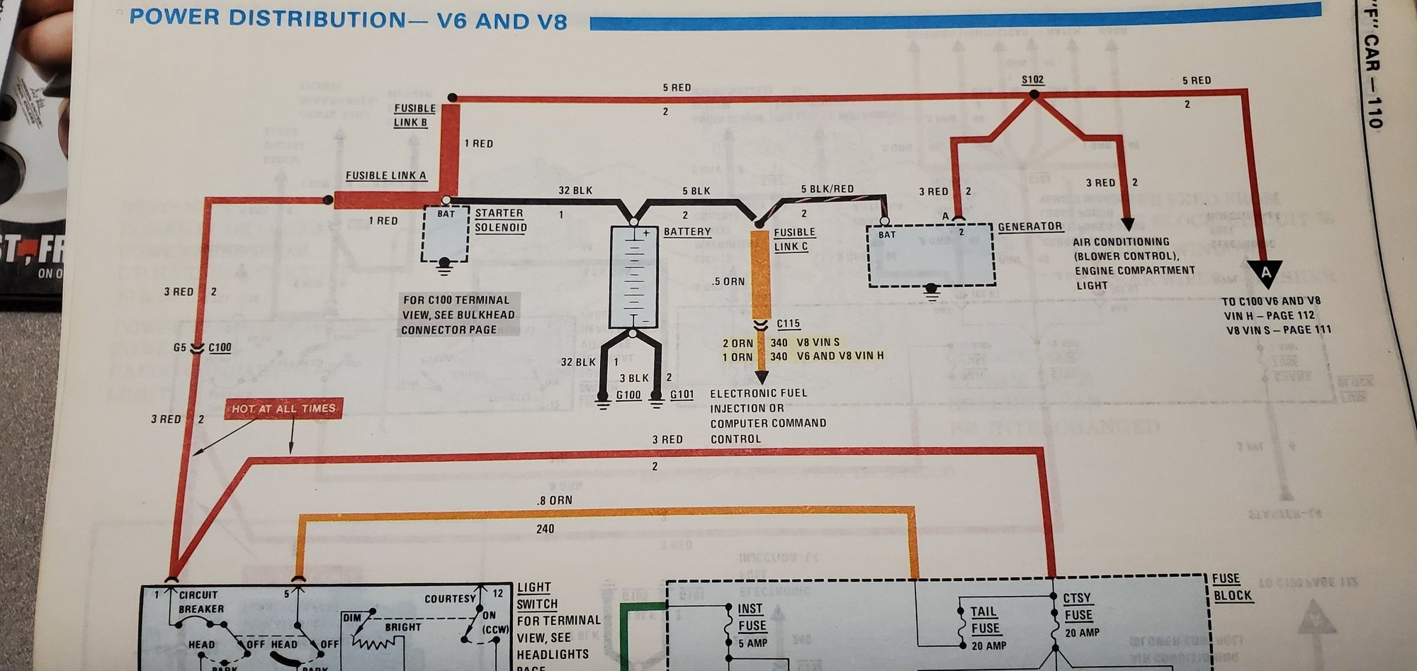 Ok, dug into things a little today, so this orange wire with this that looks like a connector i take it as being the "C" fusible link to ecm/fuel injection, that tested on both sides with power, so good. Testing for power from the fusible links A&B at the starter, with key on power from there is getting to the +red wire at the 2 pin connector to alternator and to +red to ac/heat blower control and from there that wire goes down to and connects the fusible link H ( which i can not find ) and goes into/for ignition switch and then continues to the fuse block and connects to one of the circuit breaker fuses, tested those 2 and there is power to and through both