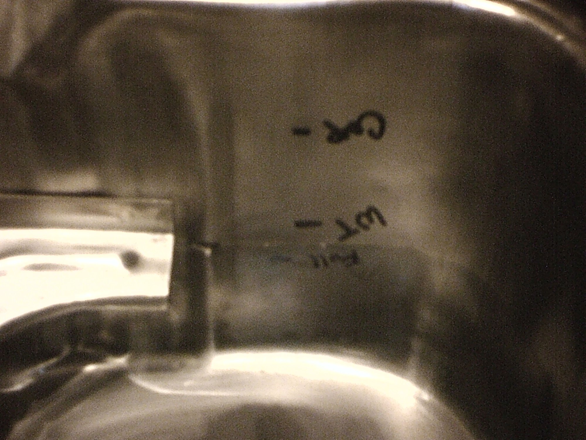 Here is my stock oil pan (sitting level) with 4 quarts of water poured in it.