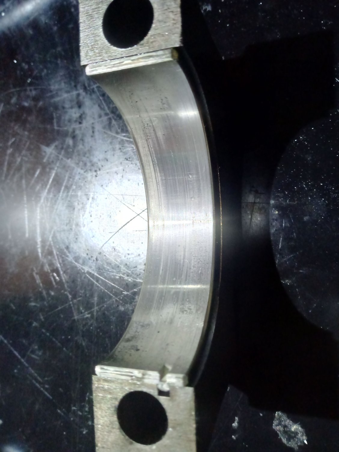 Since a few months, i recognized some knocking/tickling noise on my 305, 88 Camaro. First thougt was that noise comming from the hydr. roller lifters. After adjusting them, i feel that this noise is comming out of the lower part of the block/oilpan. Yesterday i pulled the front axle down to get the oilpan down freely. First i checked the oilpump, but that looks fine. No wearings and no noise when spinning the pump. Then i pulled down the bearing half's of the crankshaft. And here are the results: