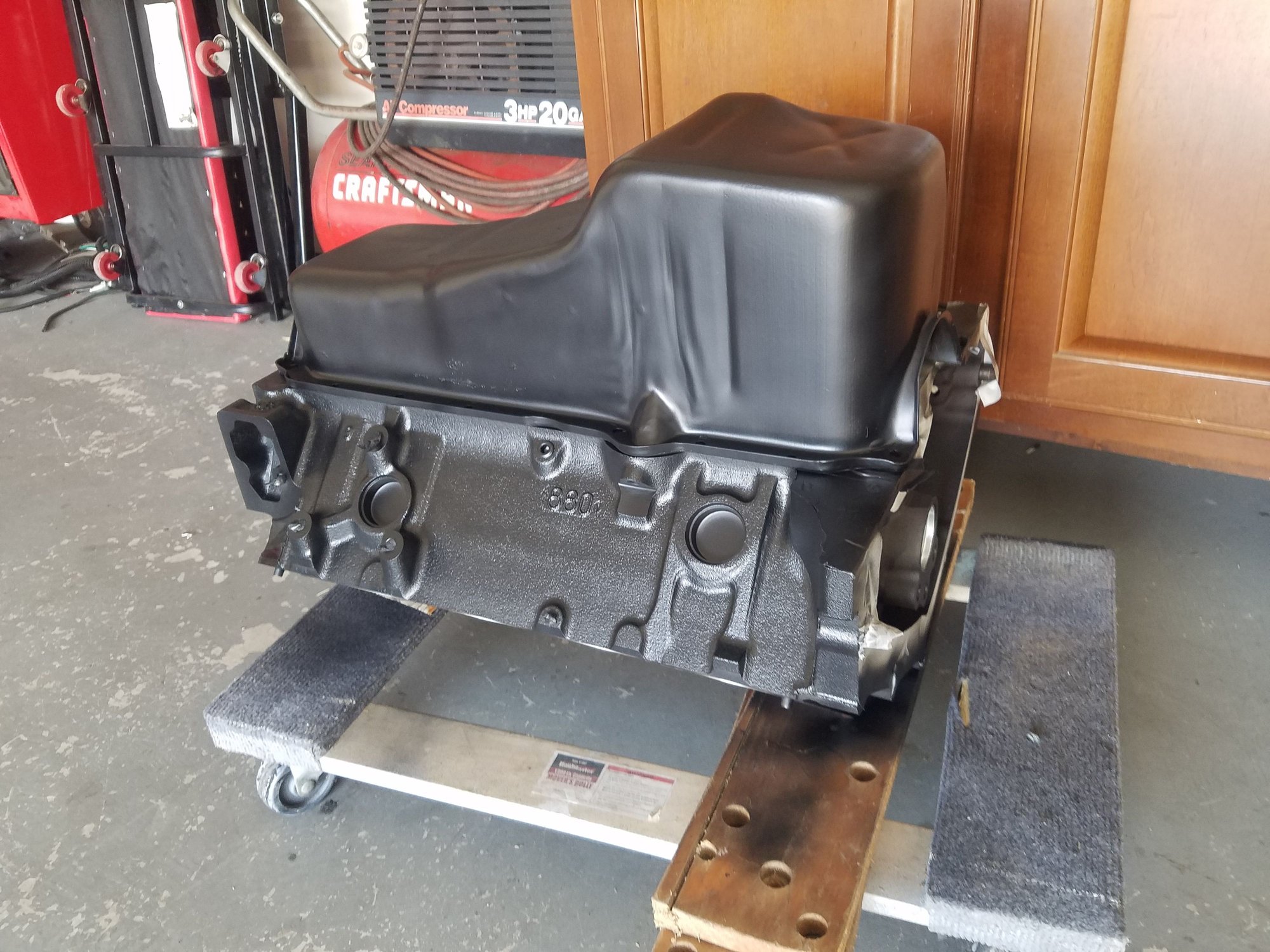 Small steps yesterday and today. Painted the block and pan yesterday - went with low gloss black. I spent too much time considering what color to paint the block - wanted to stay away from black but couldn't come up with a better option. Chevy orange was out as it is going in the Trans Am, and Pontiac blue wouldn't look right either. I had hoped to find a color matching the wheel paint I used for the inserts - graphite, but couldn't find it in either VHT or Duplicolor engine enamel. So, low-gloss black. Those little Harbor Freight furniture dollies come in handy for all sorts of projects. I think I've used mine for just about everything EXCEPT moving furniture.