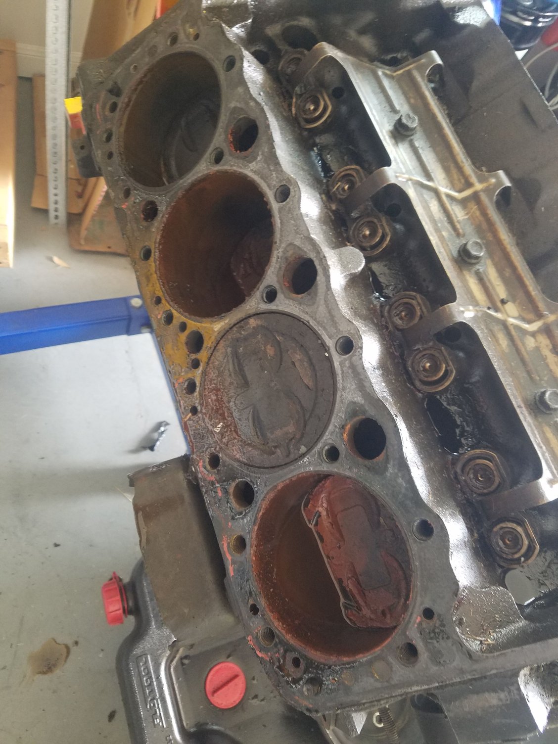 Brought it home, mounted it up, and started giving it a closer look. Used my inspection camera through the plug holes - driver side 1 - 3 - 5 looked amazing! Cross-hatching clearly evident, walls looked spotless. At 7, things got a bit dicey. Could see a bit of rusty sludge at the top of the cylinder wall. Went to passenger side and knew right away the heads were coming off. 2 and 6 had signs of corrosion on the walls. Driver side Passenger side. Oil present in some of the cylinders, either squirted in there to loosen up the rings or major issues going on in the heads Cylinder 2, worst of the group