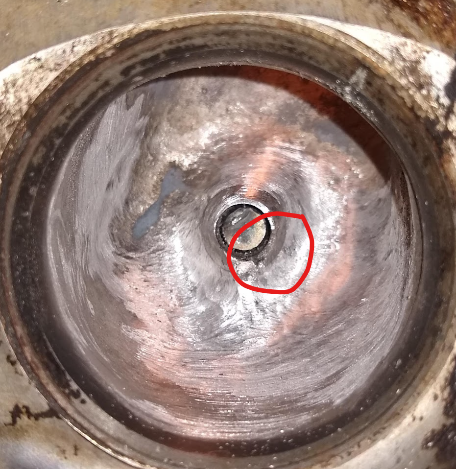 Reshaped welded port, circled is the missing bit of valve guide. This is before final finishing with tootsie rolls...