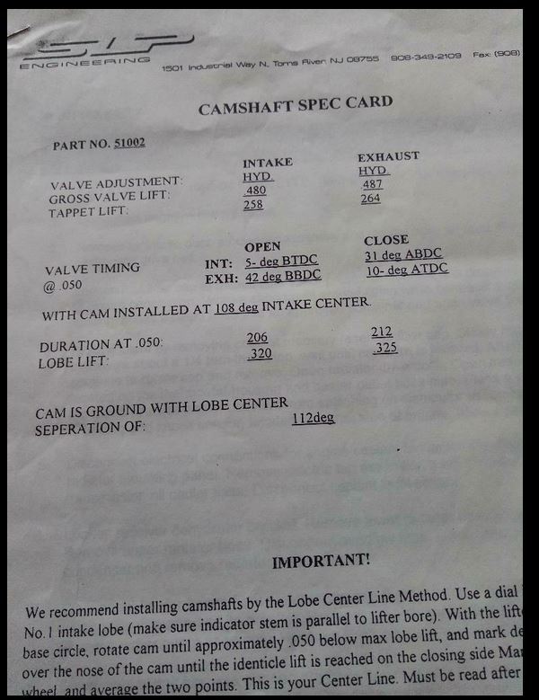 The SLP 51002 camshaft was successfully degreed in according to camshaft manufacturer specs with intake valve closing 31° ABDC.