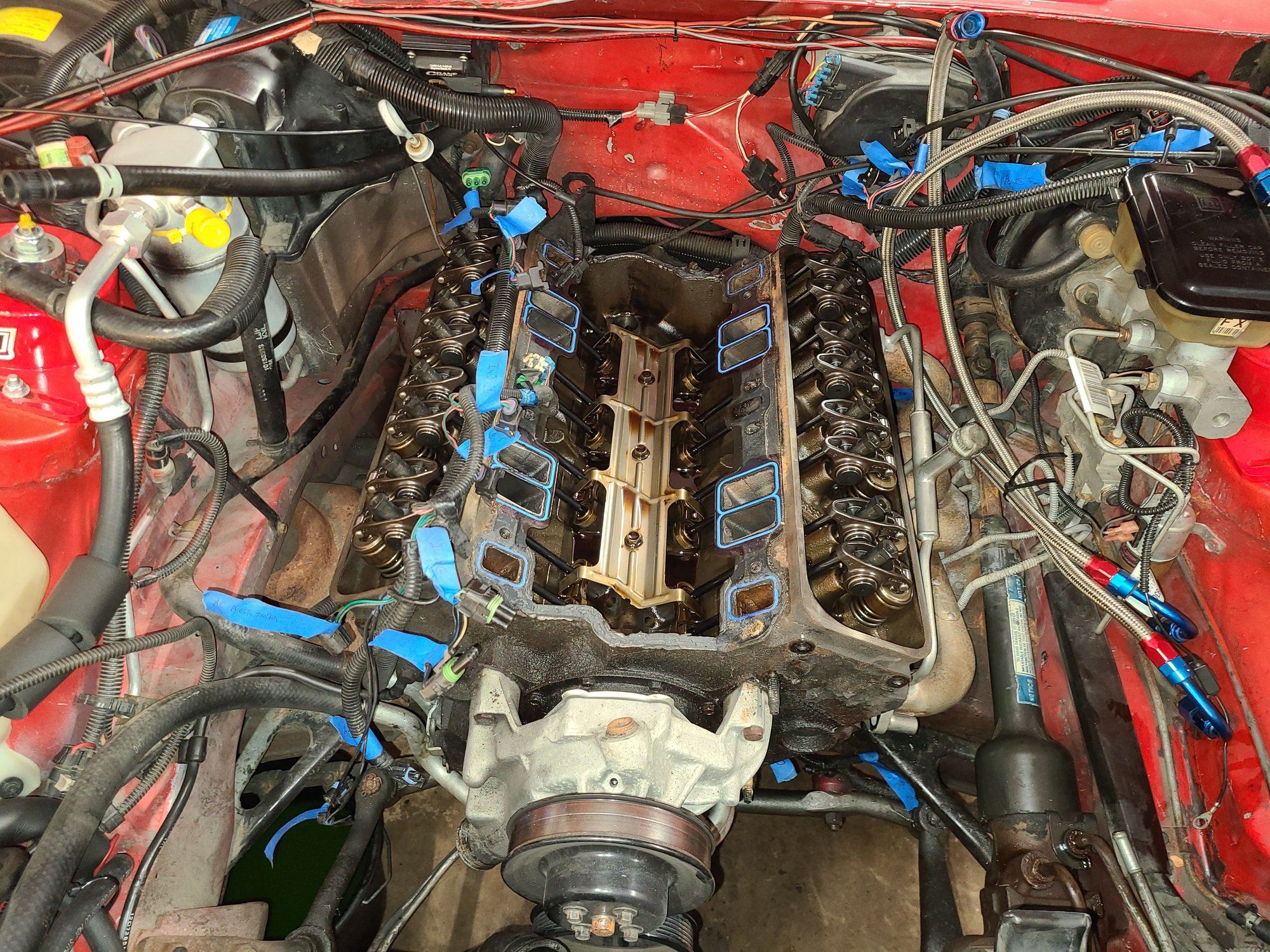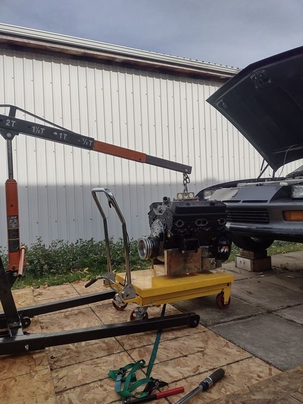 Deal with the hood as you need to obviously. I've found that's it's not how high up you can go with the engine hanging off of the hook, but also how far back you can go. Prior to this manifold plate I used, I had four corners (at the heads) fixed to an engine leveler. The leveler simplified the drop in although it took up a lot of space vertically and horizontally between the crane hook, the hood and the engine. It absolutely necessitated the hood being removed. Your mileage may vary as they say.
