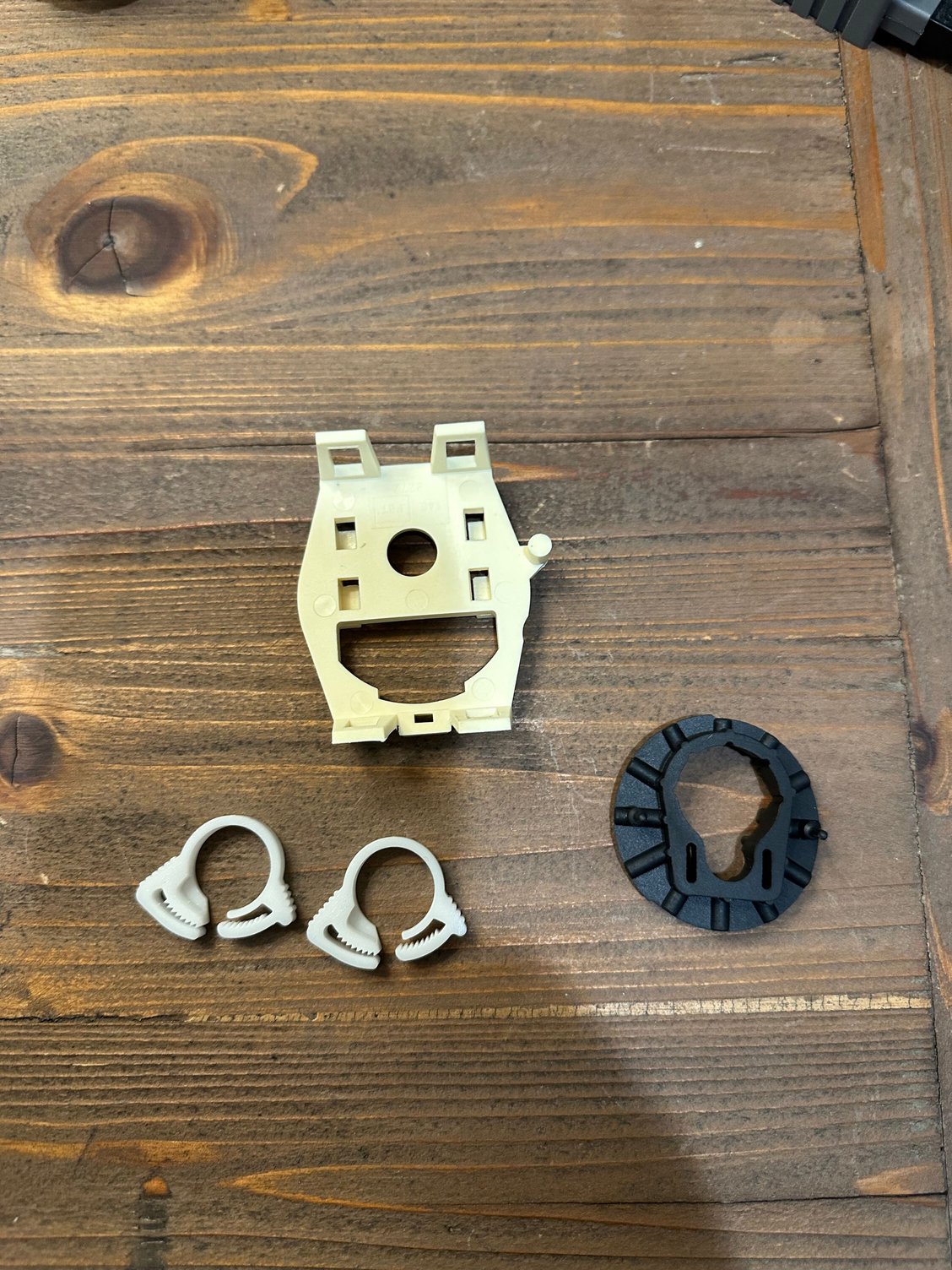 The big off white plastic part is not used in your application. The two bright white parts are hose clamps. The round black rubber bumper donut piece is not used in our application.