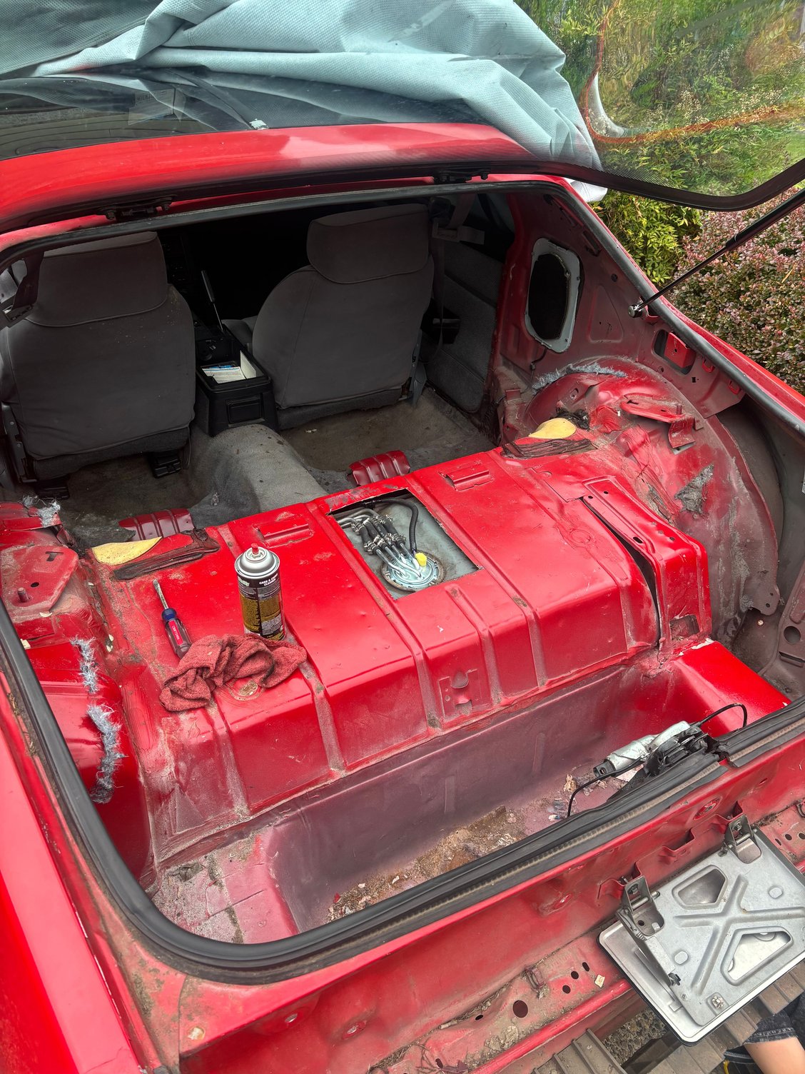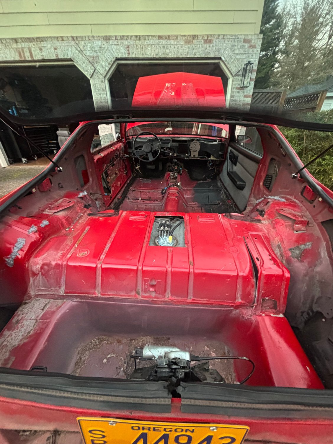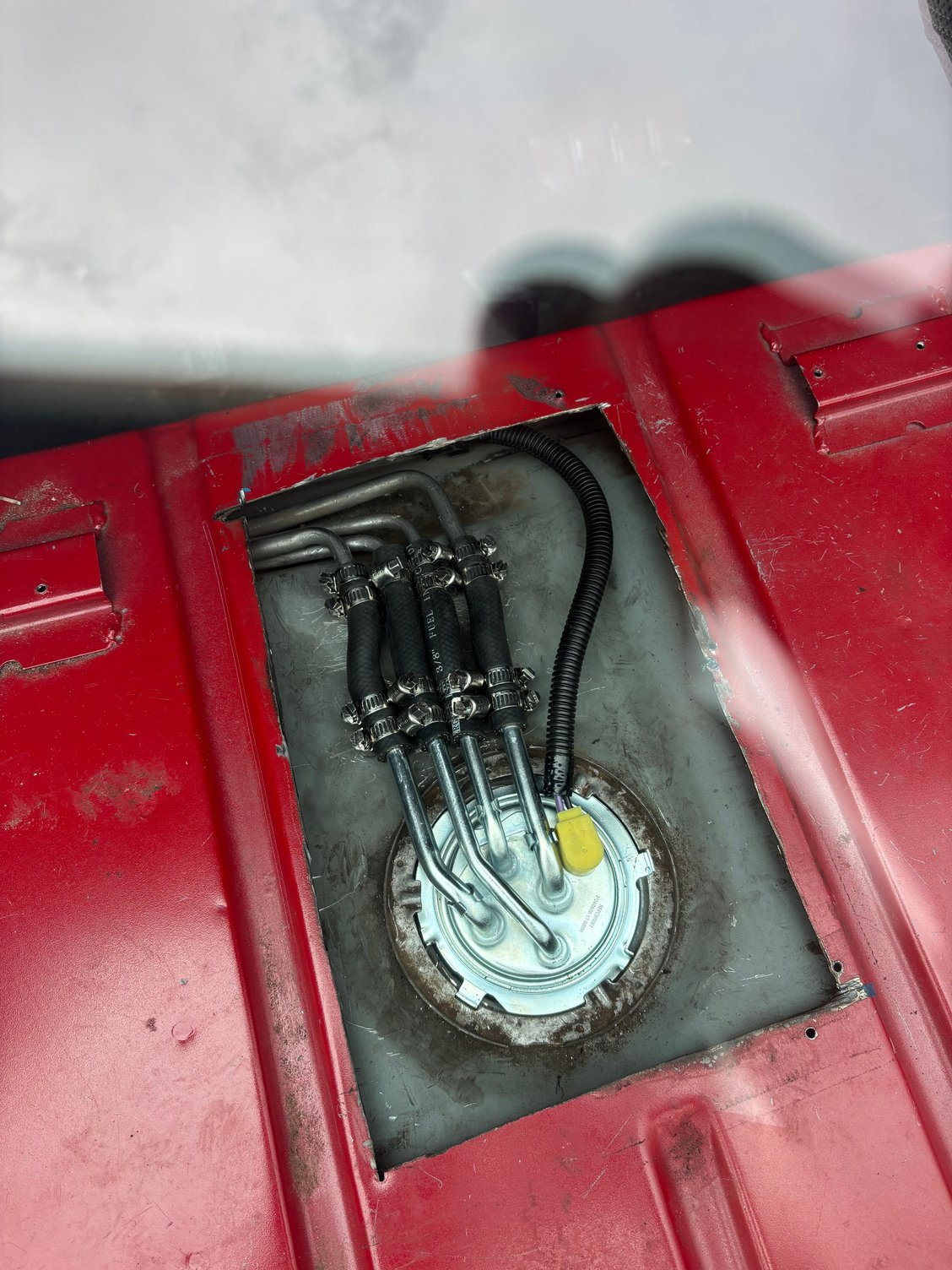 I was going to change the fuel pump as well, and as we were tearing out the interior to my surprise, I found that someone had already cut a fuel pump access, so we replaced the sender, fuel pump and connector hoses while we were at it. The original hole was cut like ****, and whoever did it just left the flap of sheet metal folded over it. I cut it off, and once I get the car running I’ll clean up the hole and actually install an access panel.