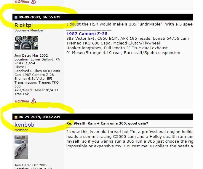 Thats really funny because almost every team for the nhra uses desktop Dyno even Super Chevy magazine did when they built their own 372hp 305 oh it also put down those numbers N.A with lower compression for boost then added boost and put down 612hp. But like I said believe what you want to but isn't it funny that everyone said the stealth ram is overkill for a 305 but Super Chevy did it and pulled 372hp. Also Rick at Crackaway racing engines in California built a 355hp stealth ram 305 but if you still believe it is impossible fine. Yes it makes a little less torque but I'm also trying not to grenade my t5 until I get my tremec