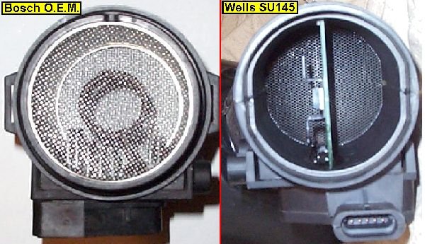 The replacement Wells SU-145 is a new part, not remanufactured. Very much like the later Hitachi, LT1, and LS1 units, it uses a thick-film transducer on a single, flat circuit card instead of the sensitive hot-wire element placed in a sampling tube inside the housing that can fail so easily. Because of the reduced switching current required since there is no wire to heat up, it also has no internal heat sink fins. In place of the round wire screens that occupy each end of the stock Bosch sensor housing, there is a single flat metal matrix at the inlet end only to delaminate air flow for a more accurate reading. The I.D. of the sensor body is larger, and the cross-sectional are of the sensor (minus the internals) is a lot larger.
