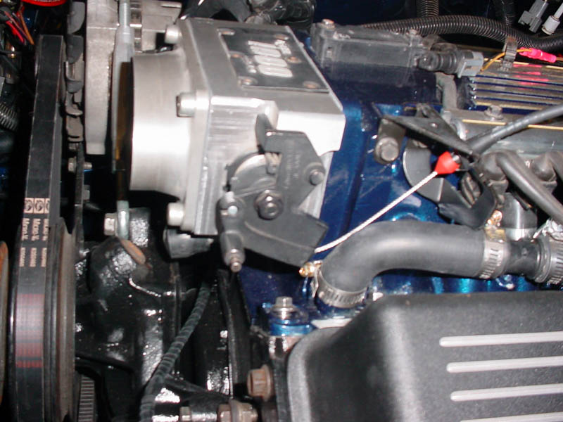 i posted this on the alternative intakes board but that one does not get browsed as much as this one does, but anyway, i bought this 58mm accel/lingenfelter tb for my lt1 intake swap that im doing and it is the 89 and later style. anyway, i have the front nipples on my intake and do not want to move them to the back. So, the new style tb's linkage hits the nipple but if i trim some off the cable guide as indicated by the tape in the picture, it would clear the hose. My question is, do you think this will affect the cable in any way (mess with how smothly it works, chew the cable, ect.), i plan on rounding the cut edge off by using a file. Also, i bought an lt1 camaro throttle cable, but have not had time to test fit to see if the cable is long enough to reach the pedals.