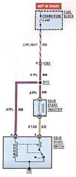 The tan wire on the CSC provides the ground for the cold start injector. The purple wire gets 12V from the CRANK fuse when the starter is operated and operates a heater element within the control. The heater element heats the temperature switch so that the CSC will not ground the start injector on subsequent start attempts. Once the engine has warmed up, the thermal element will be heated by the coolant to prevent grounding the start injector. If the engine is allowed to cool below 35ēC again, the CSC will ground the start injector for another crank attempt.