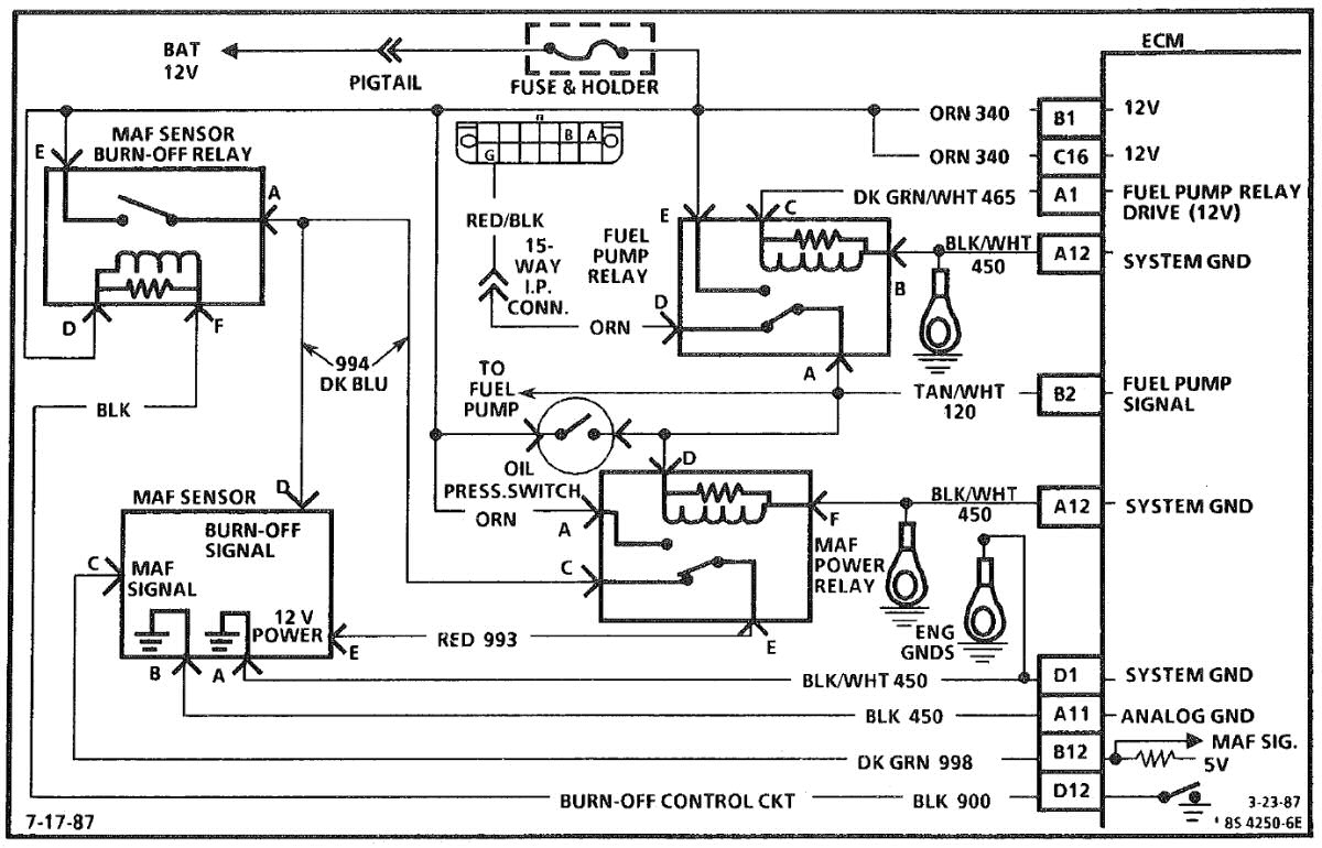Verify the +12VDC supply at the MAF "E" terminal. Also verify a proper ground at the MAF "A" terminal. If the voltage and ground are not present, the MAF power and burnoff relays and their wiring need to be checked.