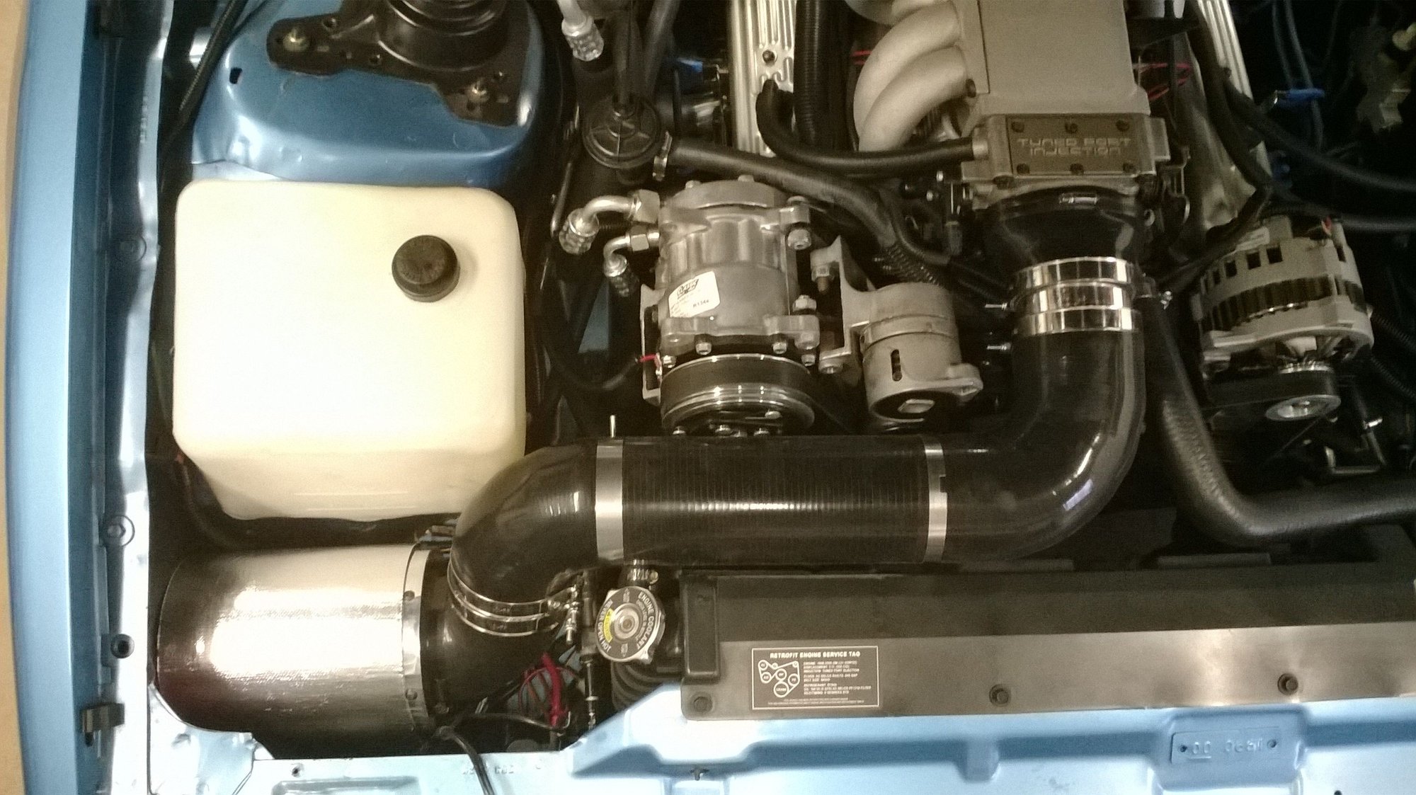 So, I have attempted several different versions of getting away from underhood air. After relocating the canister under the headlight, I first tried a 4-inch addition to the stock air cleaner canister (see photo). This very much accomplished getting "cold" air in, but I decided that the stock air inlet tube was probably insufficient for my mild 350 vortec TPI. I based this on the data log kPa readings I was getting over 4,000 rpm; as much as 4 kPa drop. Second try accomplished using 3-1/2 inch from throttle body to a 4-inch inline air filter that was then sealed to the inner fender. There was barely enough space for this with A/C, etc. In fact, I had to find a molded 90 degree hose to clear the coolant overflow line. There's about 3/8-inch clearance to the A/C pulley and less hood clearance than that, but it just clears. The air around here right now is pretty bad (90+ with dew points in the 70s) so I will probably wait until better weather to determine the effectiveness of the bigger intake. I know the stock inlet actually necks down pretty small at one spot, and I figure, hey, bigger's not gonna hurt, right?