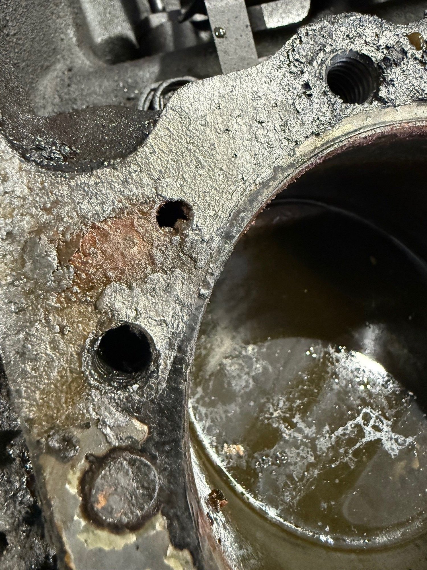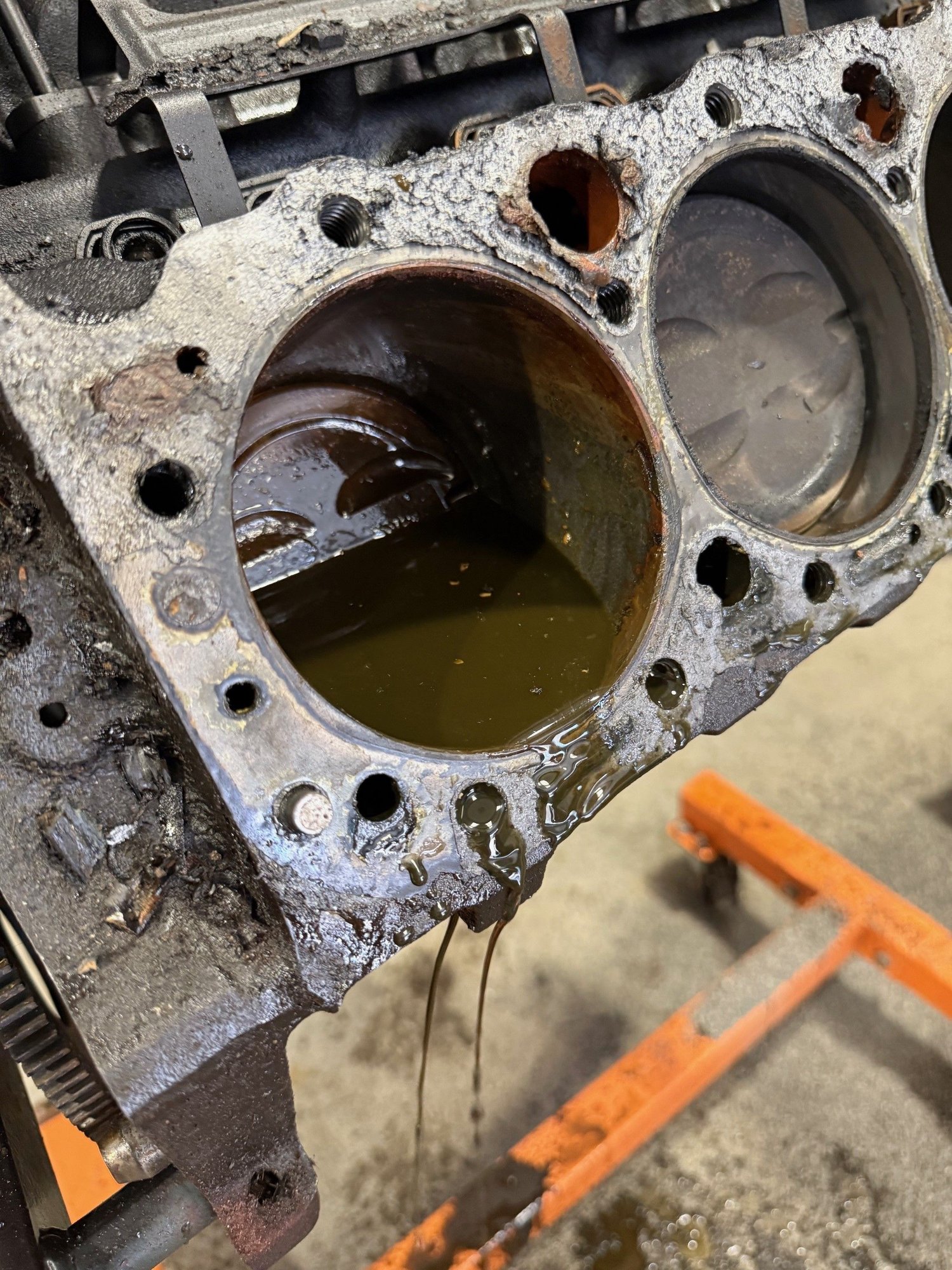 I’m about 75% of the way towards getting the engine out of the car. Lots of coolant in the oil pan. Pretty sure this thing was driven hard thru its life; it has a full BMI suspension, so I can see the previous owner beating the **** out of it.