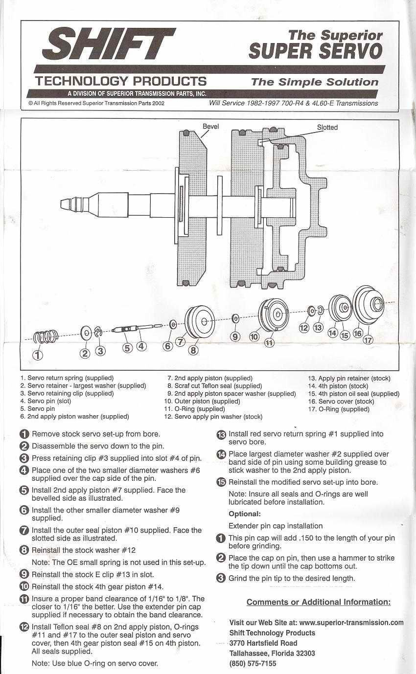 Thanks for the info, I’m not looking for something really extreme just a little more than stock to give it a quicker 1-2 shift but the sonnax looks like a quality part, lot of choices for this and I want a quality servo. I saw global transmission had one that is drop in ready to go but do not know much about their quality