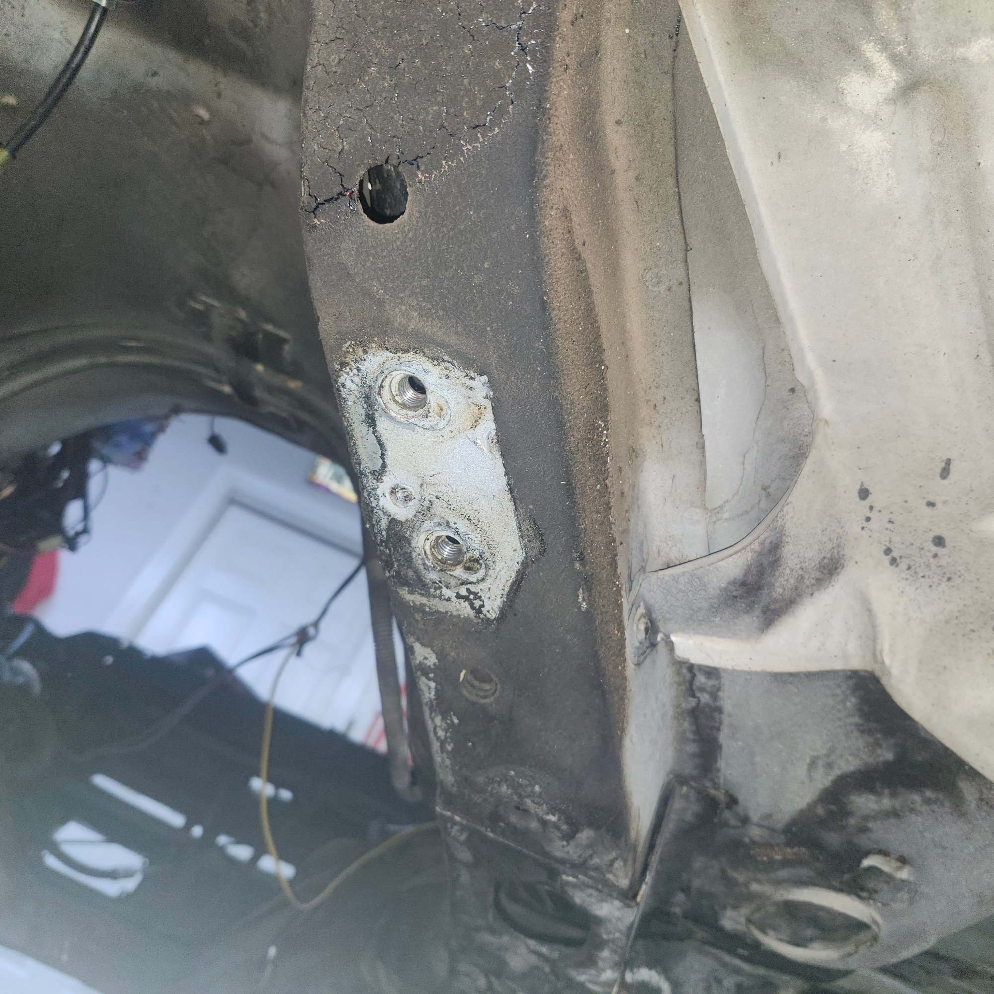 Ideally, tapping the two and using all 6 is ideal. I actually removed all the "nuts" in the frame. Then made to 2- 2(ish) inch wide pieces/strips of 1/8 steel w three holes the same as the frame/x-member. I fully welded gr8 nuts to the metal strips. I welded a wire to the strips and fished them in the oval access hole in the frame. Then, once in place I drilled 2 small holes in the frame and welded the strips to the stock frame. This gave me 6 real nuts actually welded to thicker metal to distribute the load of the x member. Now, the metal around the plate is only so strong and will it crack w 5-600hp? We'll see.