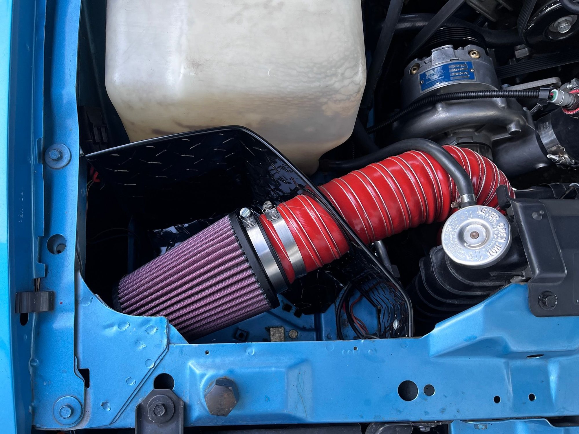 I plumbed it up using 3" flexible silicone intake hose and a step-down coupler to adapt it to the 3.5" intake on the supercharger. The 3" tubing just barely fit between the radiator and the A/C lines to end up on the passengers side where the charcoal canister used to be.