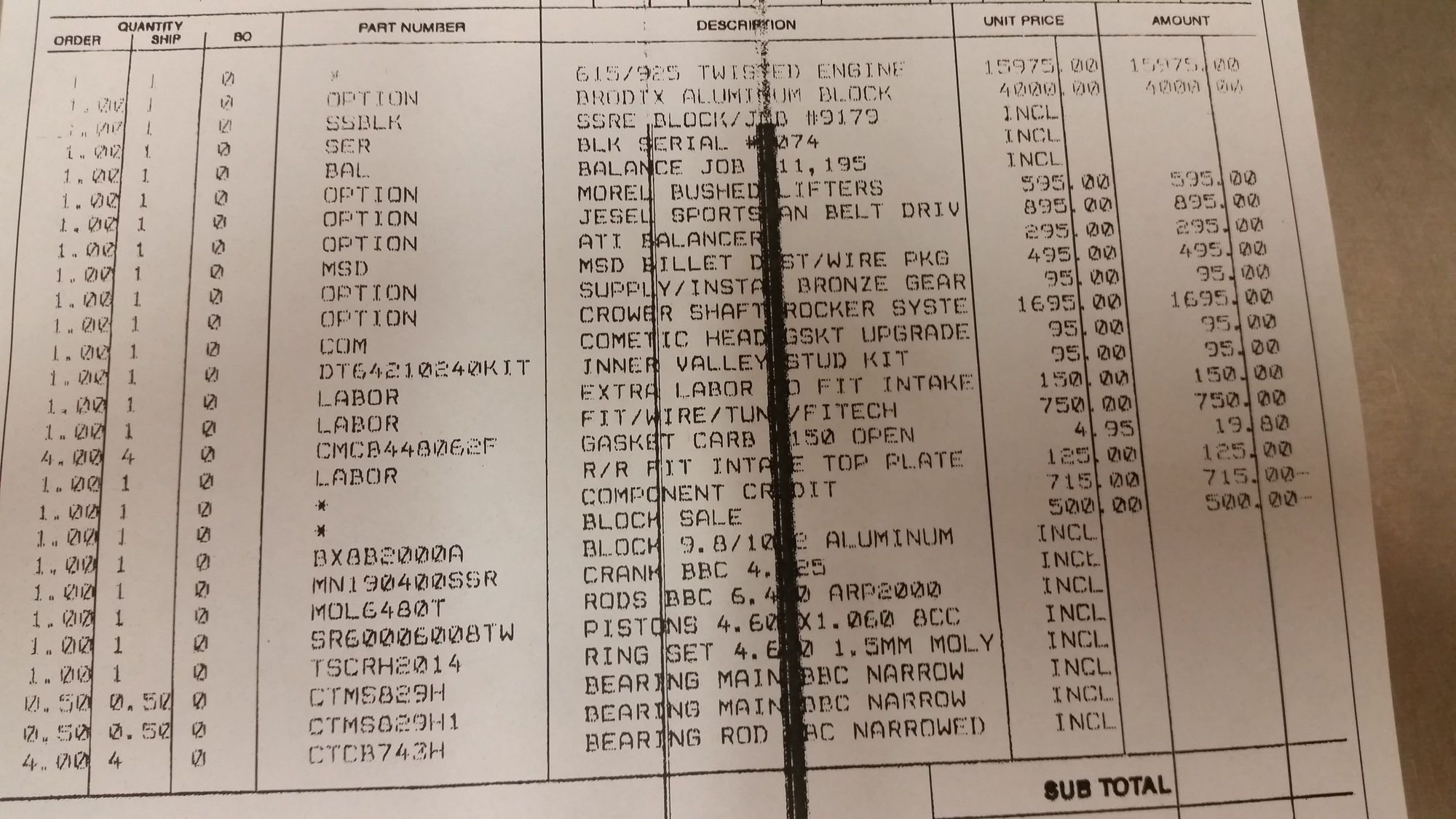 A l ist of a few of the parts.. they did Not use the New MSD distributor I sent them something about the block being a tad bit taller but it still considered a short block.. or the composite gear I sent them.. this is a mechanical roller and a quote Vinny.. it sounds nasty.. brodix 380 heads..