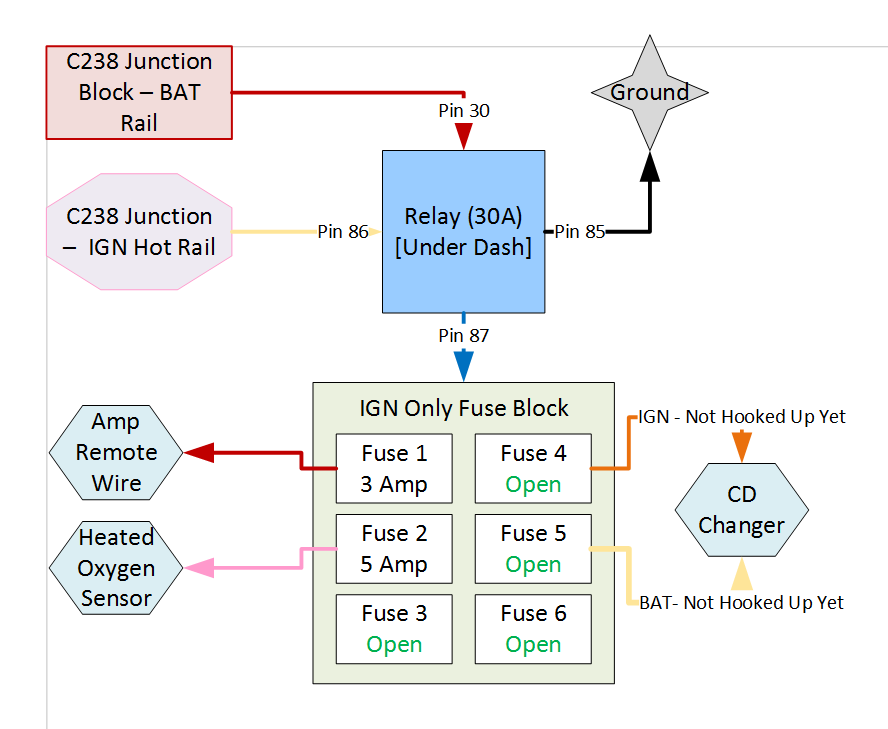 Wiring schematic for IGN Hot Fuse Block with Relay.
