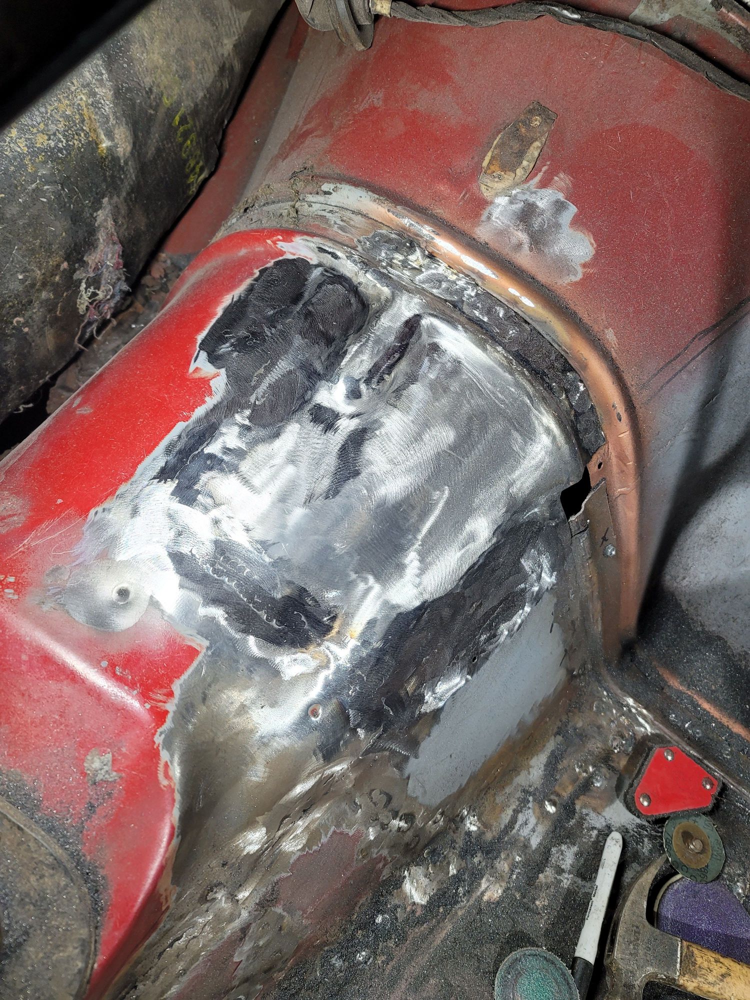 Back to floor stuff, there was some pitting and pin holes up here so I cut this out and use a piece from the repop panel I was given.