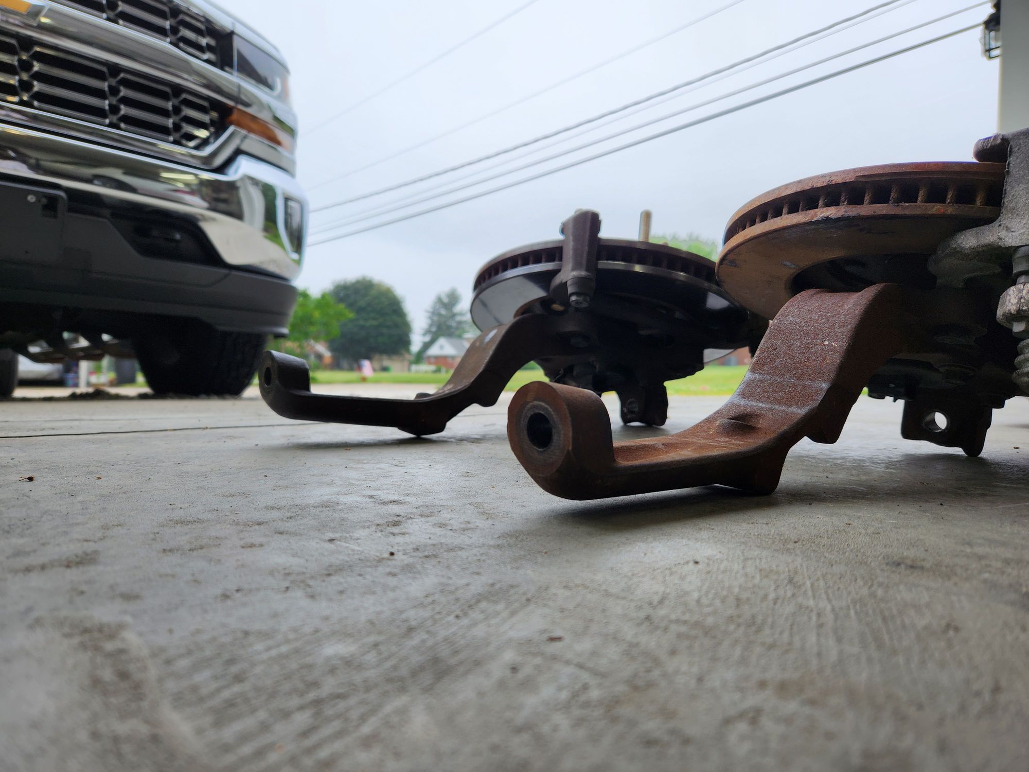 Here you can see the difference in the bent spindle(rear), and non bent(front). The top half of the rear spindle is bent up towards the rotor. The top half of the front spindle lays flat, near parallel to the floor