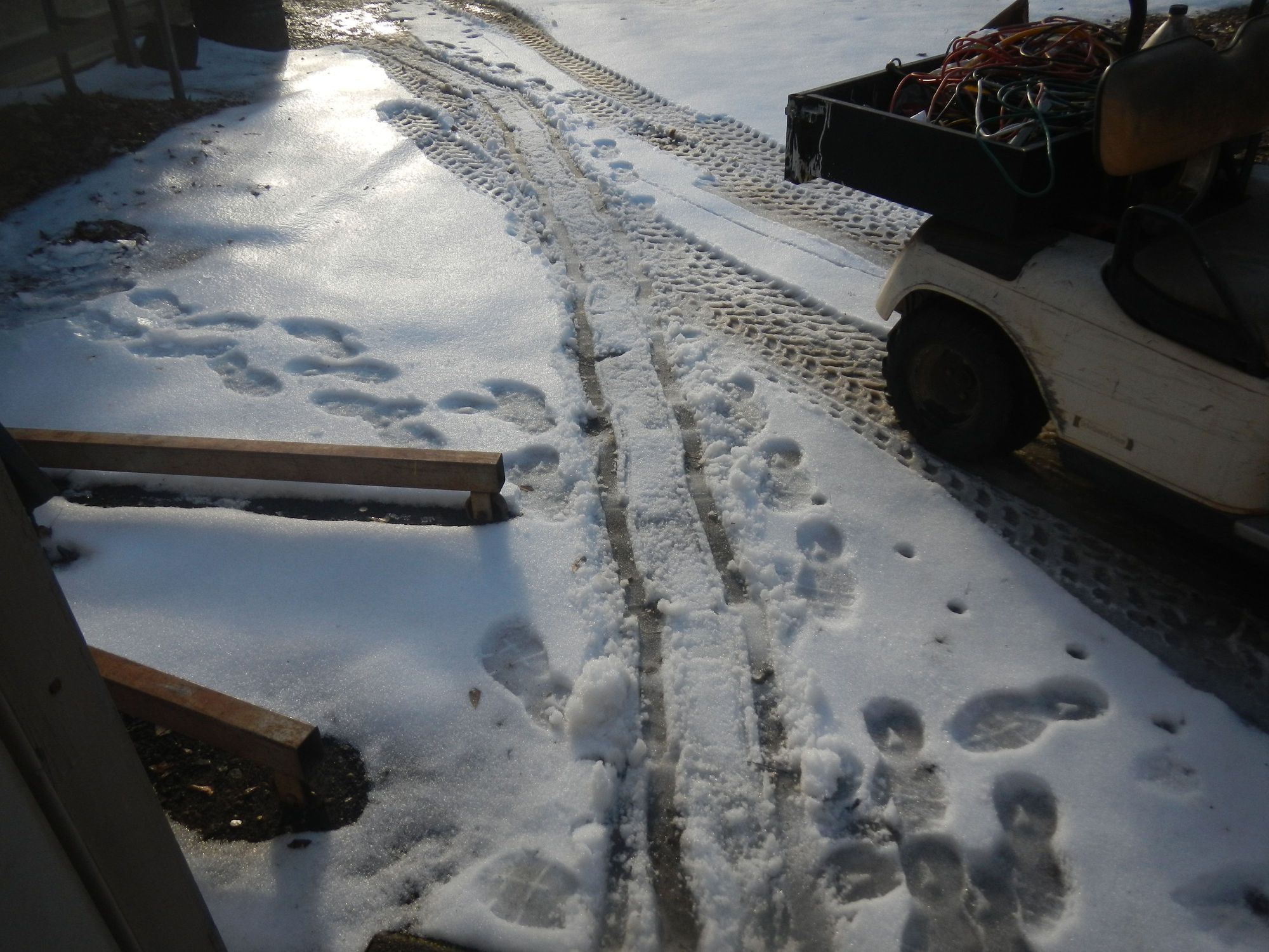 Dragging the second floor jack from the other shop in the snow.