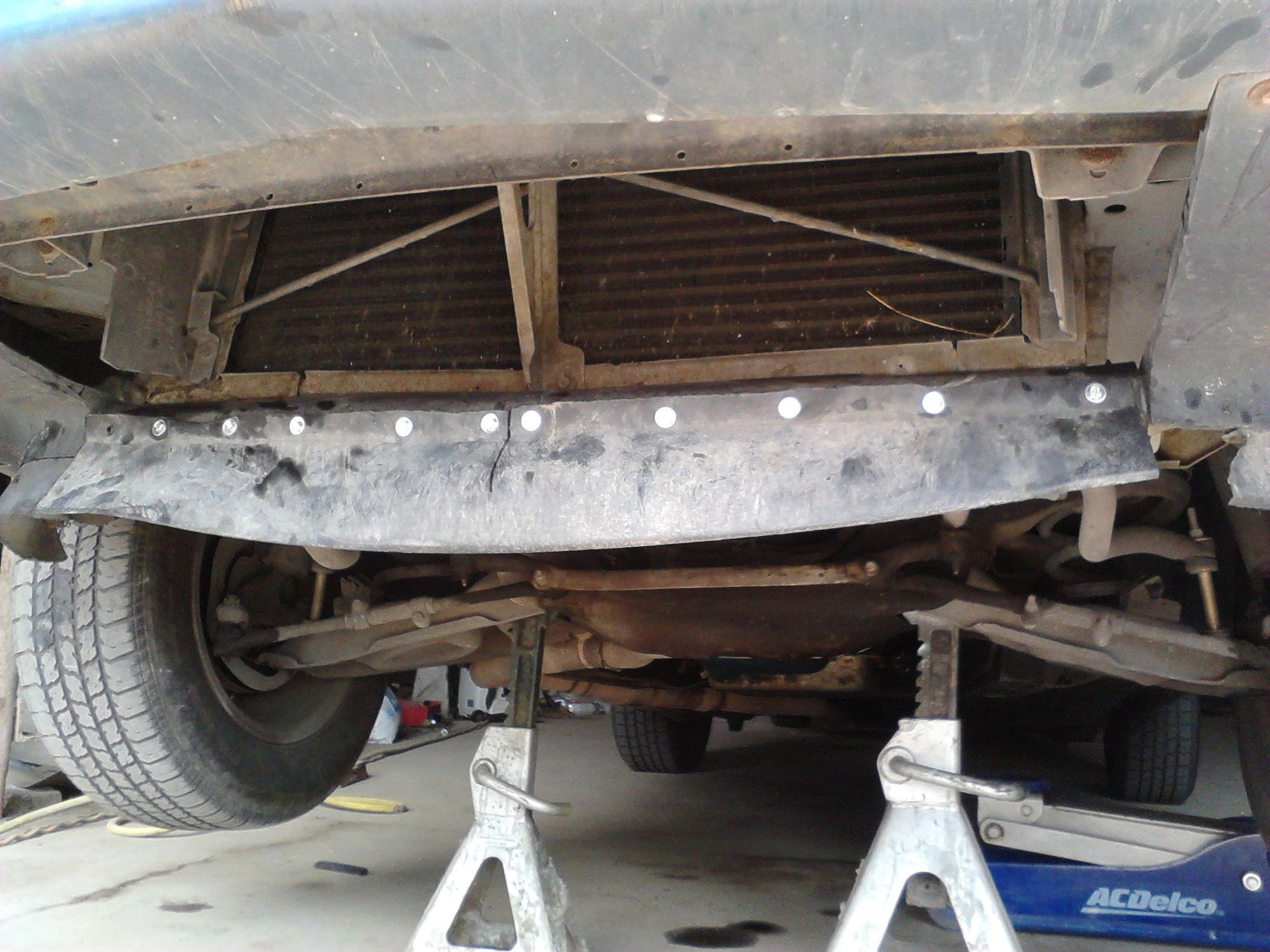 Here is the repaired air-dam. I made the repair panel out of the air-dam from a mid-'90s Camaro. I cut out a section of it, and bolted it onto the original air-dam base.