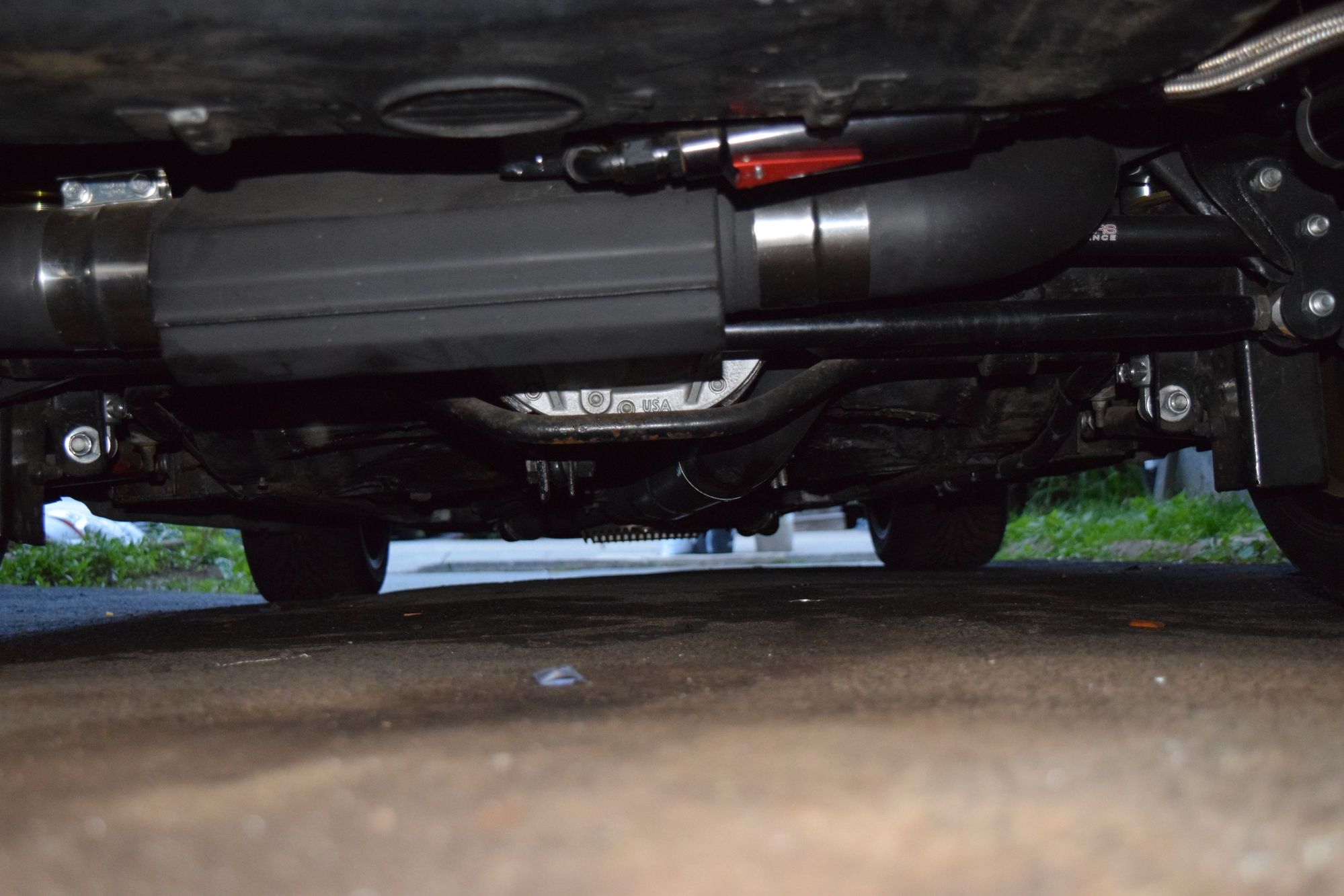 Close up back shot of under car. 4" is still pretty loud only on the throttle honestly at idle it's very quiet and I suppose the dual mufflers help :)