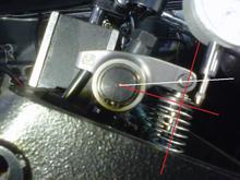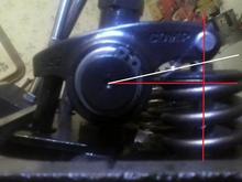 Valve is closed with the lifter on the base circle. The roller tip axis is exactly half the net valve lift above the trunnion axis. The red lines represent the valve centreline and a 90° reference.